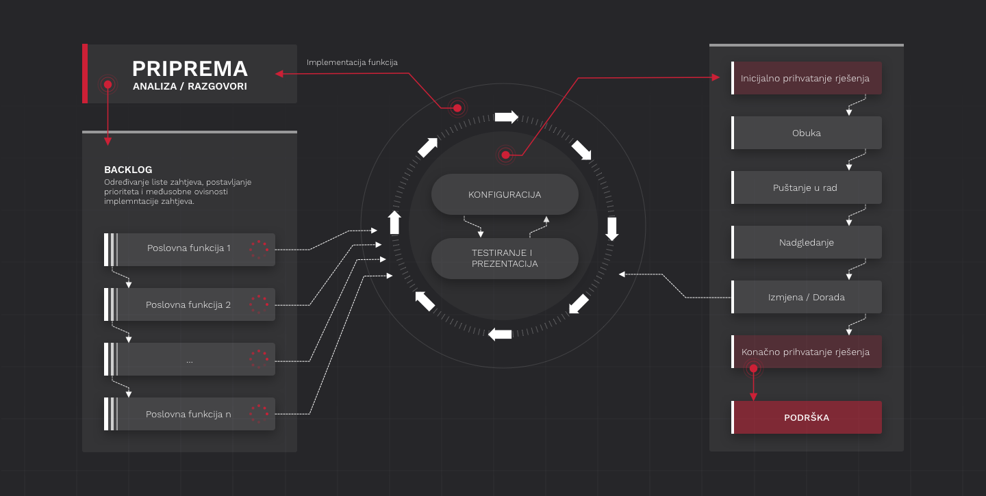 Koristimo moderne agilne metode u procesu implementacije u kojima se fokusiramo na brzo postizanje rezultata. Proces počinje analizom poslovnih procesa korisnika, njegovih potreba, zahtjeva i specifičnosti. Nakon određivanja liste zahtjeva, odnosno funkcionalnosti koje je potrebno implementirati kreće se u proces konfiguracije rješenja. Taj proces se odvija u više ponavljajućih faza. U okviru svake faze se kreira rješenje, prezentira korisniku, dorađuje, sve dok se ne postigne zadovoljavajući rezultat. Nakon obuke korisnika, rješenje se pušta u rad, nadzire se, te se prate i obrađuju eventualni zahtjevi za korekcijama. Potom se dobiva konačno rješenje, koje se opet u toku eksploatacije može mijenjati i dorađivati.